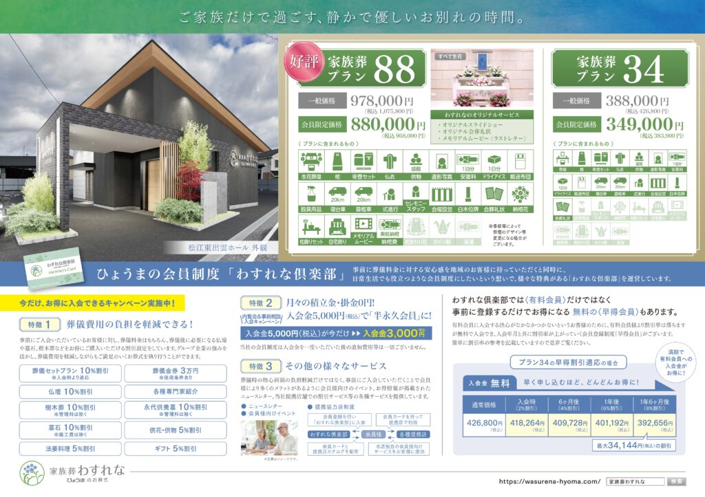 家族葬わすれな 松江東出雲ホールでは、内覧会&見学会を開催いたします。